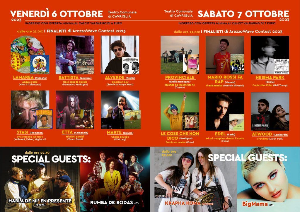Sabato 7 ottobre, serata di chiusura e premiazioni, vedrà sul palco le ucraine Krapka Koma con un live set elettronico e coinvolgente, basato su una varietà di strumenti che creano una fusione di paesaggi sonori elettronici con un tocco acustico; il gran finale sarà con la rivelazione di quest’anno BigMama, già sul palco di Sanremo 2023 con Elodie nella serata dedicata alle cover. La giovane rapper di Avellino è una delle candidate italiane per MUSEXPO 2024 (a marzo in California), molto apprezzata dai giovani per i suoi testi e la sua voce, è diventata un simbolo del ‘body positive’, in fine saliranno sul palco i magnifici 12 finalisti scelti dalla giuria di ArezzoWave.