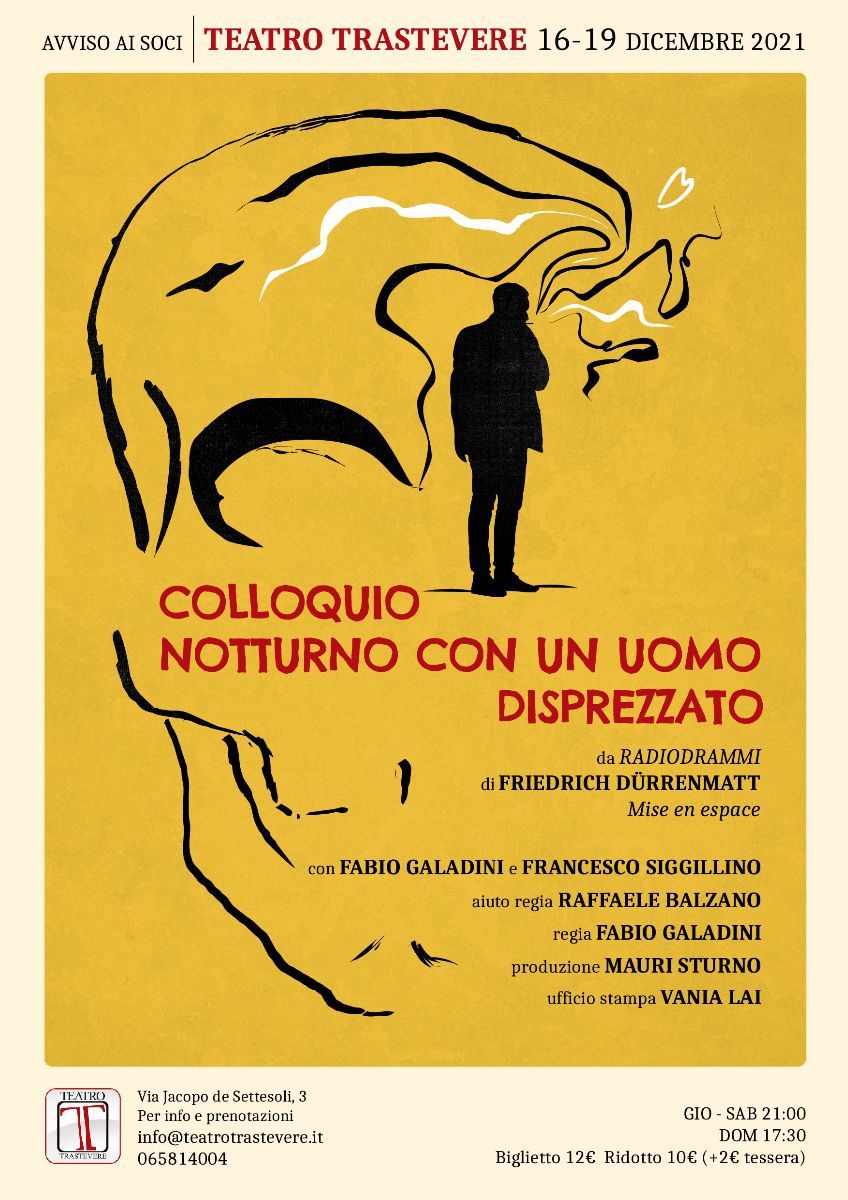 Lo sguardo è altrove, impegnato nell’atto di ricostruire nell’immaginario un’azione drammaturgica che non è mostrata palesemente. Sicché un teatro di voci in radiodiffusione, interdetto alla vista, ideologicamente complesso; gli interpreti dialogano in sequenze concatenate l’una all’altra in un gioco di suspense emotiva e d'investigazione psicologica, sempre più serratamente proiettata verso l’irrevocabile sentenza. Nel Colloquio notturno con un uomo disprezzato il boia e l’innocente quasi incredulo dialogano intorno al demone del potere tiranno che uccide i corpi degli uomini innocenti, senza mai poterne soffocare lo spirito o cancellarne la traccia intellettuale e morale. Qui il “radiodramma” viene messo in scena perché esiste un teatro che può partire da un radiodramma: il teatro morale in senso universale, dove l’unico protagonista, senza alcun gioco retorico, è il messaggio che problematizza il reale, scardina i luoghi comuni e obbliga alla riflessione, in una parola educa e alimenta in sé quella che Leo De Bernardinis definì essere: «una grande forza civile». Il ribaltamento del ruolo sociale e il significato del potere, smascherare le meschinità nascoste dietro una facciata perbenista sono i “temi”di Durrenmatt.