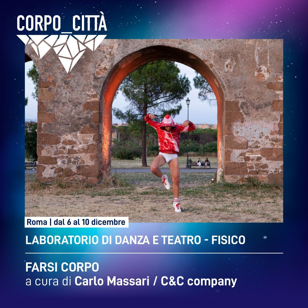 cinque giornate di eventi artistici - il 3,4,8,10,11 dicembre – negli spazi del Parco di Torre del Fiscale, un parco urbano, parte del Parco Archeologico dell’Appia Antica, che rappresenta il polmone verde del quartiere del Quadraro. Gli eventi artistici si svolgono all’aperto per promuovere l’utilizzo delle aree verdi urbane anche nei mesi invernali e, in un’ottica di sostenibilità ambientale, si svolgono durante le ore diurne - dalle ore 11 alle ore16.30 – utilizzando unicamente la luce solare. Il programma prevede la presentazione delle performance / formati performativi / percorsi /… costruiti durante i laboratori e le residenze che si intrecciano con spettacoli, talk, installazioni. Questo “corpo multiplo e multisfaccettato” attraverso estetiche e sperimentazioni diverse si confronta con il corpo (organico / inorganico) della città e con i paesaggi naturali e verdi che abita.