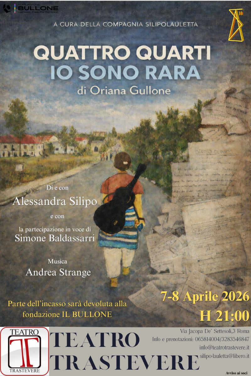 Lo spettacolo nasce dalle parole e dalla voce della giornalista Oriana Gullone: un materiale vivo, potente, intimo, attraversato da ironia feroce e lucidità poetica. Quattro Quarti. Io sono rara è un atto politico e poetico, una dichiarazione d’amore verso il ritmo personale di ciascuno, verso quelle battute irregolari che, nonostante tutto, continuano a suonare. Oriana ci consegna una musica segreta. Le sue parole sono scintille che illuminano il buio, a volte ferocemente ironiche, con lo sguardo che non si piega mai alla tragedia ma che continua a cercare la bellezza. È un atto d’amore: verso Oriana, verso chi vive con una malattia rara, verso chi lotta per essere creduto, verso chi trova la forza nell’ironia e nella verità. Il fulcro è la sua voce e il tentativo di raccontarla, ricordarla, celebrarla. Per questo la scelta è di far dialogare teatro, maschera, commedia e poesia con il materiale autobiografico che compone lo spettacolo e lo arricchisce di un taglio cinematografico: linguaggi che abitavano il suo modo di stare al mondo. Lo spettacolo racconta tutti noi, il nostro bisogno di tenere insieme i pezzi, di continuare a suonare la nostra musica anche quando la partitura si strappa. La malattia si trasforma in linguaggio scenico in un ambiente sospeso tra reale e simbolico. La regia non vuole imitare Oriana, ma ascoltarla profondamente, lasciando