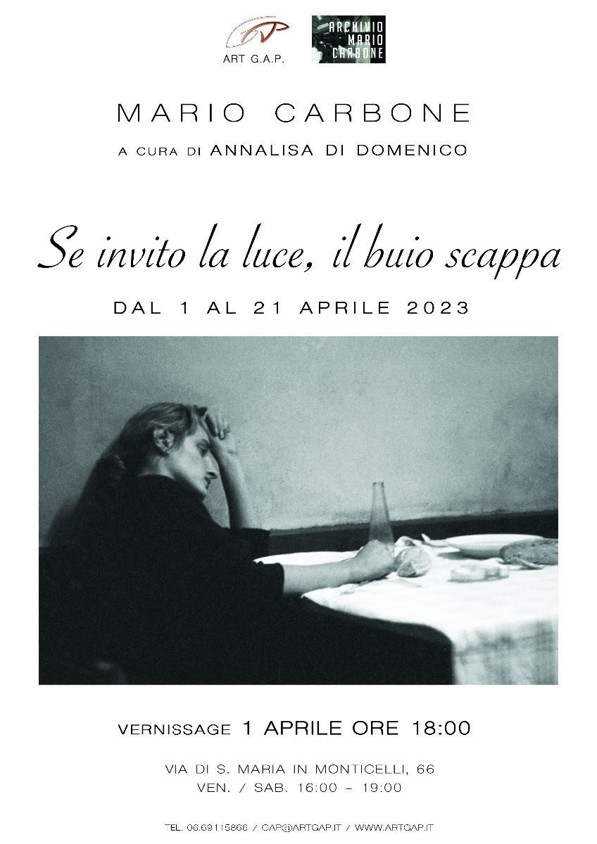 Dal 1 al 21 aprile 2023 la galleria Art GAP, a due passi da Largo di Torre Argentina, è lieta di accogliere la personale fotografica “Se invito il buio, la luce scappa” di Mario Carbone, a cura di Annalisa Di Domenico. La mostra verrà inaugurata sabato 1 aprile 2023 alle ore 18:00.